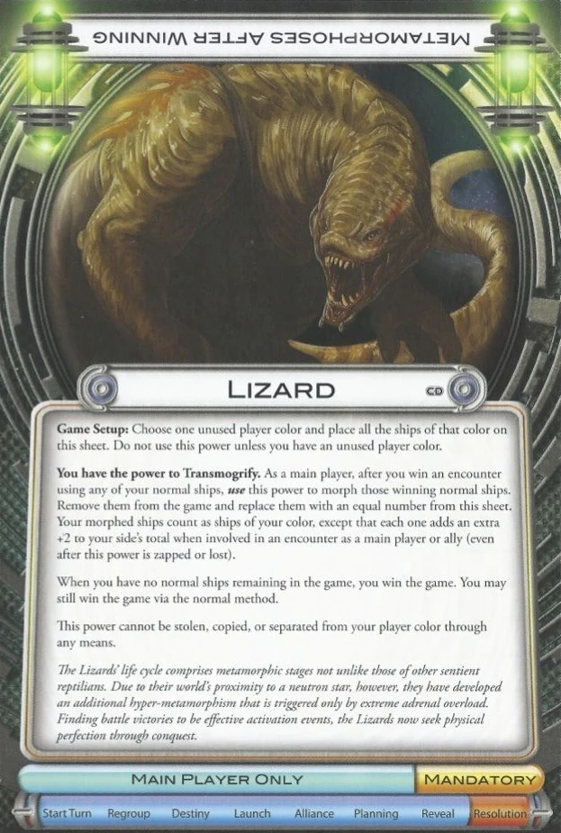 Lizard is an alien with the power to Transmogrify. It starts with all ships of an unused player color on its sheet. Each time it wins an encounter as a main player, it "morphs" all of its normal ships that it used in the encounter by removing them from the game and replacing them with ships from its sheet. Its morphed ships still count as its own ships but add an extra +2 to its side's total when involved in an encounter, even if Lizard has lost its power. In addition, if Lizard manages to remove all of its normal ships from the game, it immediately wins the game.