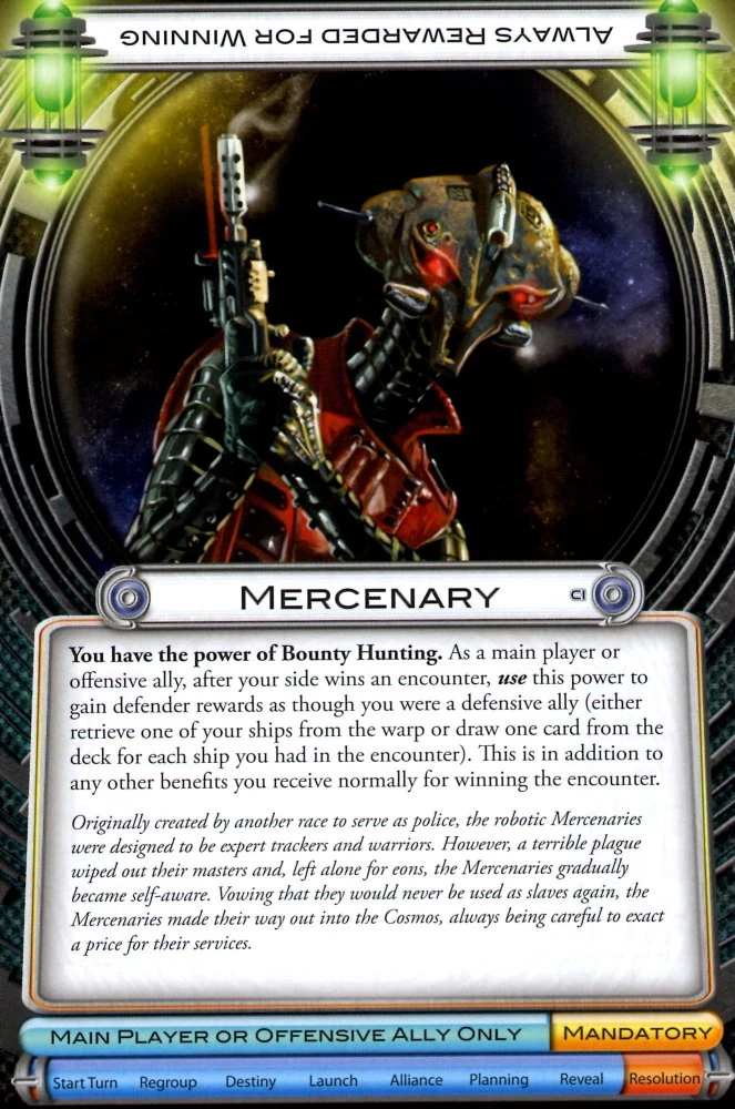 Mercenary is an alien with the power of Bounty Hunting. It can claim rewards whenever it is on the winning side of an encounter, not just if it is a defensive ally.